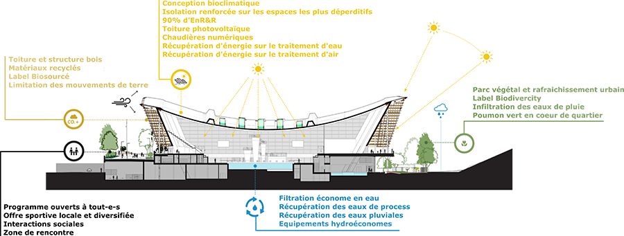 • Un bâtiment biosourcé comme le souhaitent les organisateurs des Jeux : la structure du centre aquatique est en bois (2 500m3) et le projet propose l’atteinte du niveau 3 du label « Bâtiment Biosourcé »