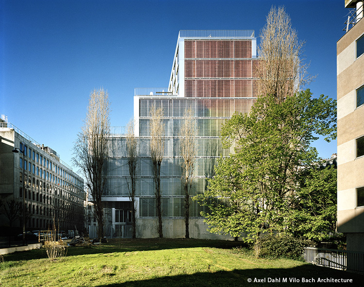 La façade en pavés de verre conçue par l’artiste Carmen Perrin et le cabinet d’architecture M VILO BACH participe à l’intégration de l’esthétique et du design dans le bâtiment, notamment demandée par la cible « Communauté » du référentiel. La lumière intérieure diffuse participe également au bien être des usagers et permet de répondre aux objectifs des thèmes « Lumière » et « Esprit ». ©Axel Dahl M Vilo Bach Architecture