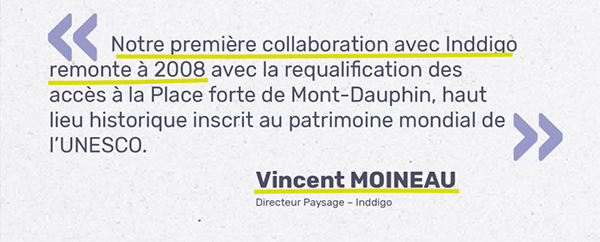 En 2006, Vincent Moineau créé son atelier du même nom, spécialisé en paysage et mobilités douces. Dès 2008, il commence à collaborer avec Inddigo sur des sites à forte pression touristique afin de les accompagner dans une meilleure gestion de leur mobilité. Les deux structures montrent ainsi leur complémentarité en proposant des stratégies de mobilité et d’urbanisme qui s’inscrivent pleinement dans les spécificités de ces territoires et de leur paysage. Elles travaillent notamment avec plusieurs grands sites comme la Place forte de Mont-Dauphin, le canal du Midi, les Gorges du Verdon ou encore Conca d’Oru en Corse.